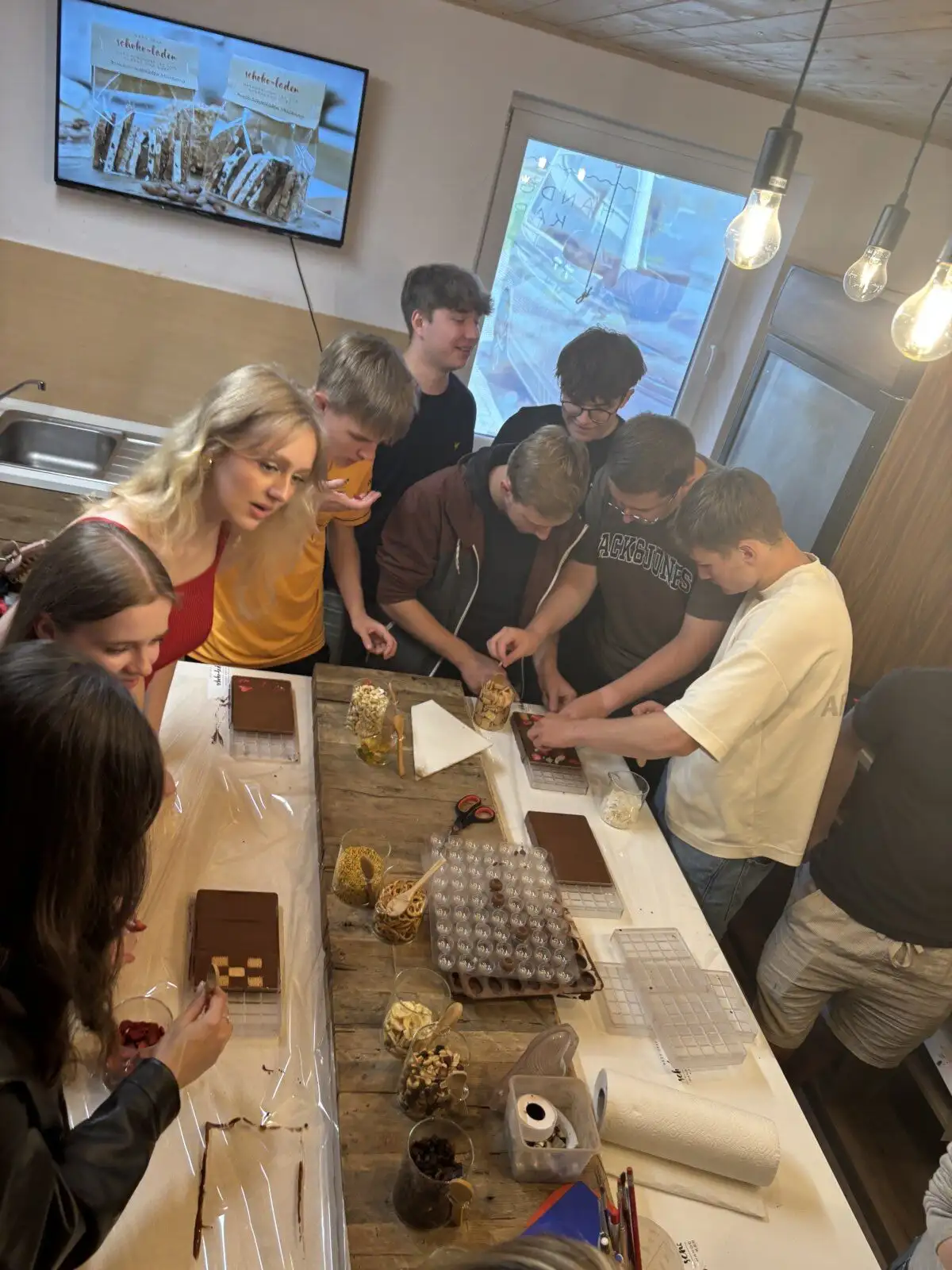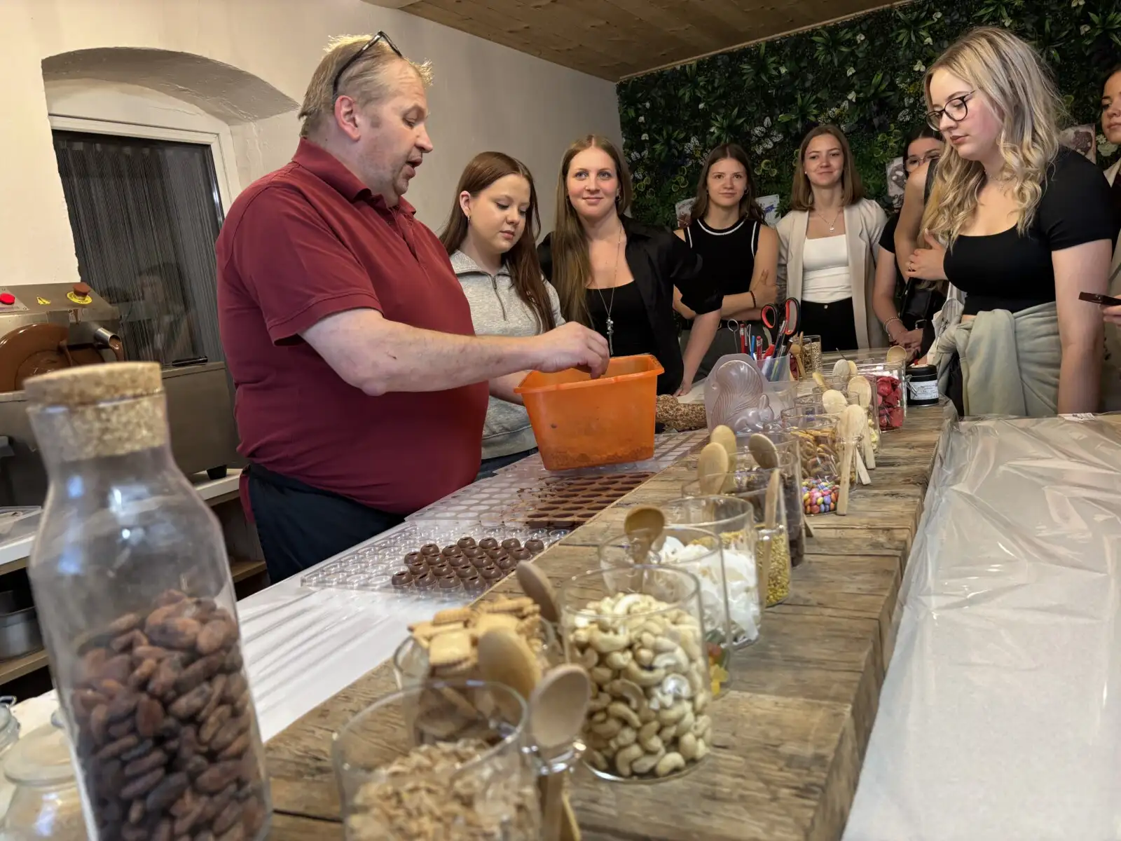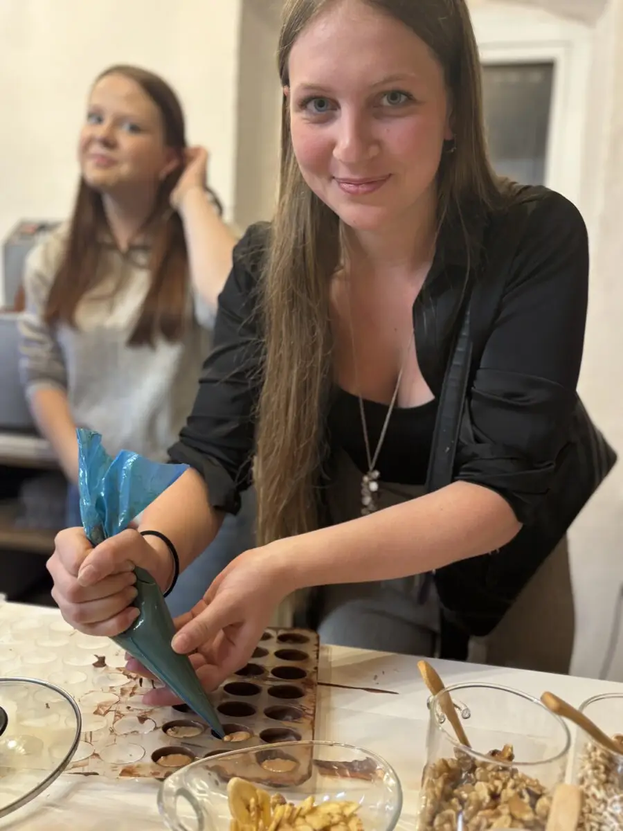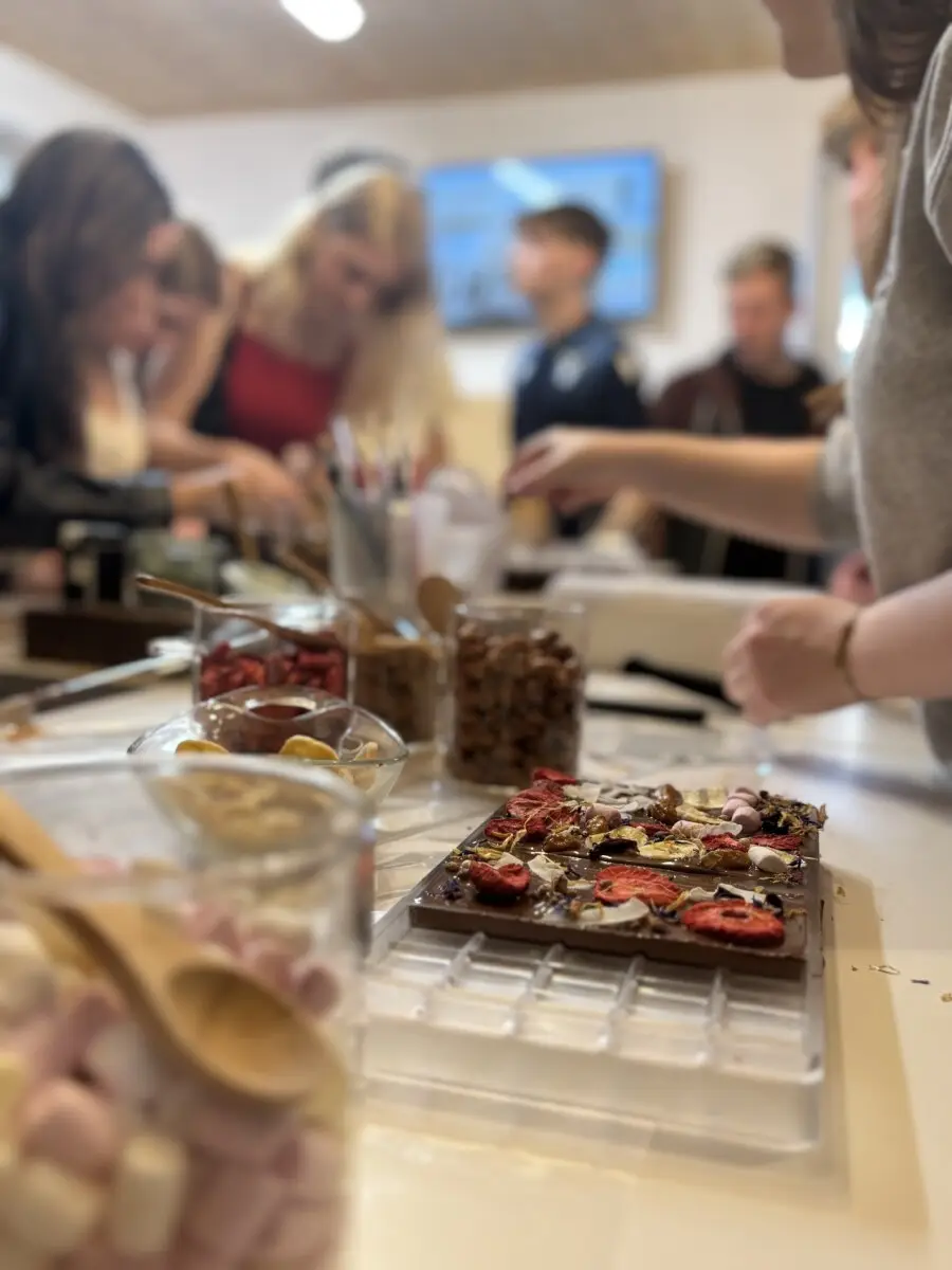 Nach einer kühlen Stärkung bei entspannter Atmosphäre im Café Dikany ging es weiter in den Schoko-Laden von Kurt und Karina Wöss. Dort erwartete die Gruppe ein Schokobrunnen mit frischen Früchten, gefolgt von Einblicken in die Kunst der Pralinenherstellung und vielen süßen Kostproben. Während Chocolatier Kurt Spannendes über seine Faszination für Schokolade erzählte, durften die SchülerInnen ihre eigene Tafel kreieren und verzieren.