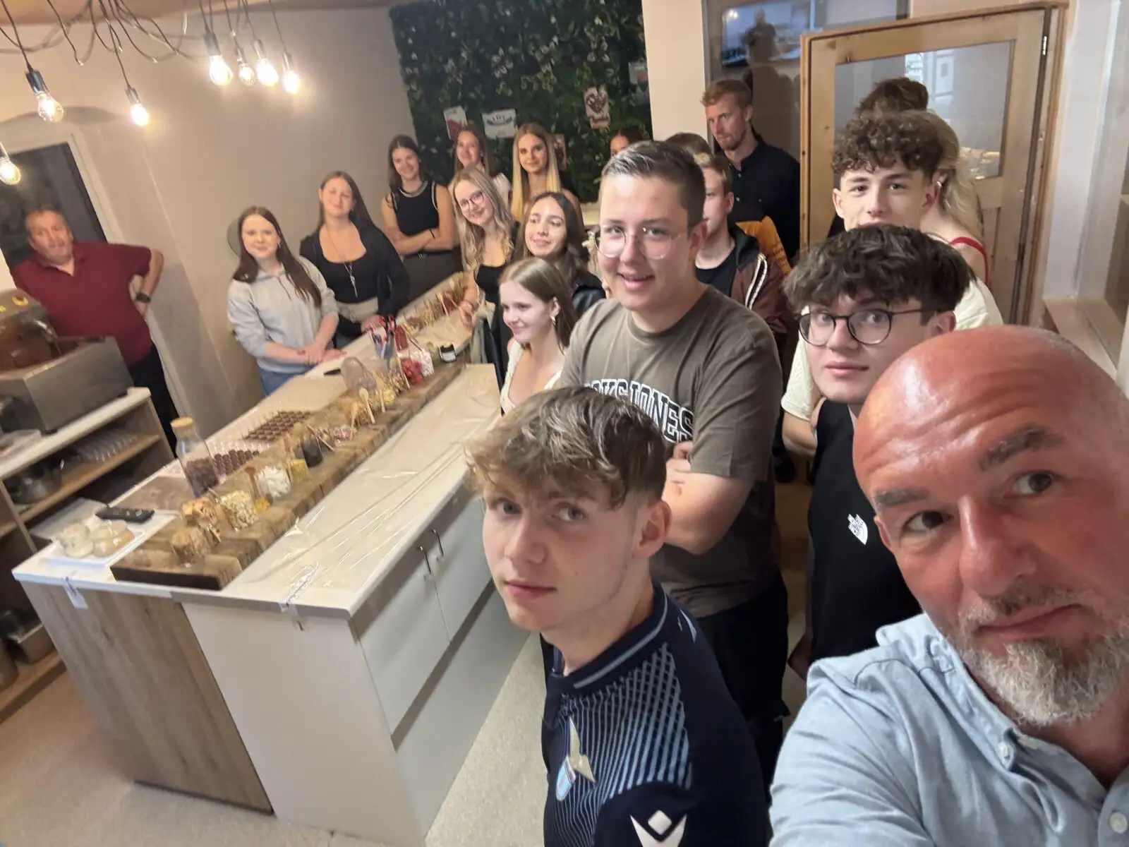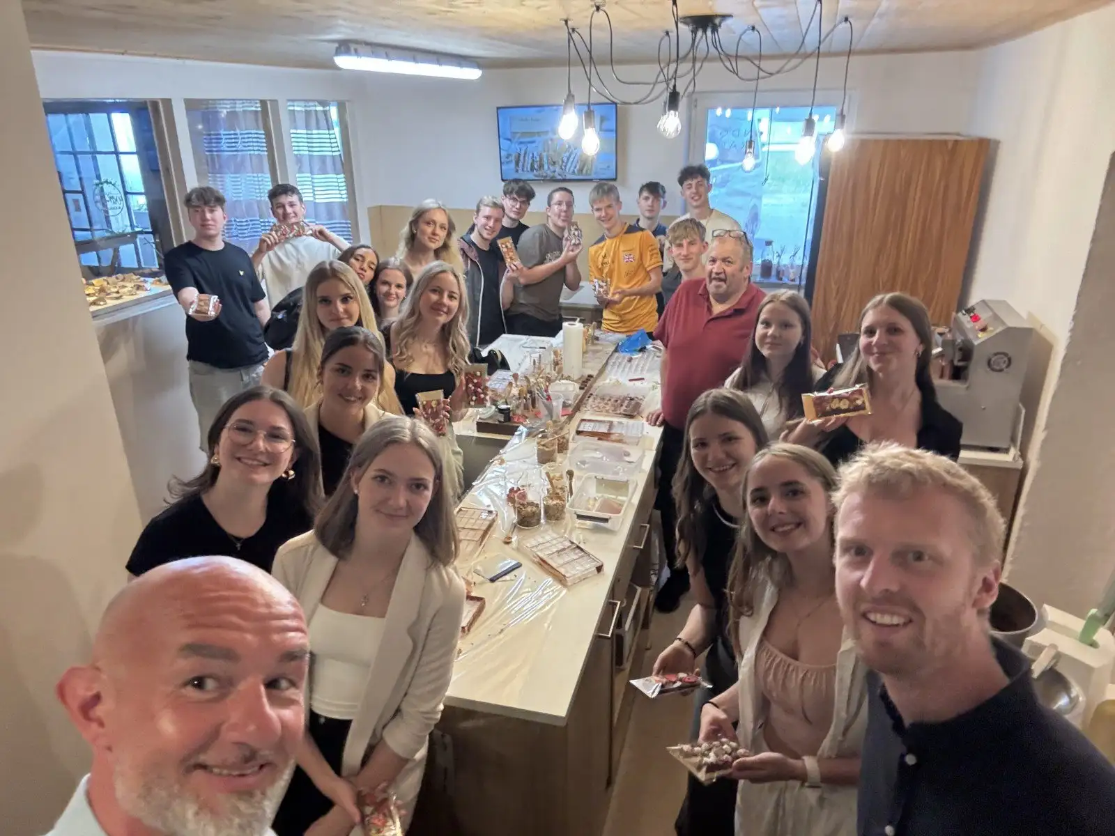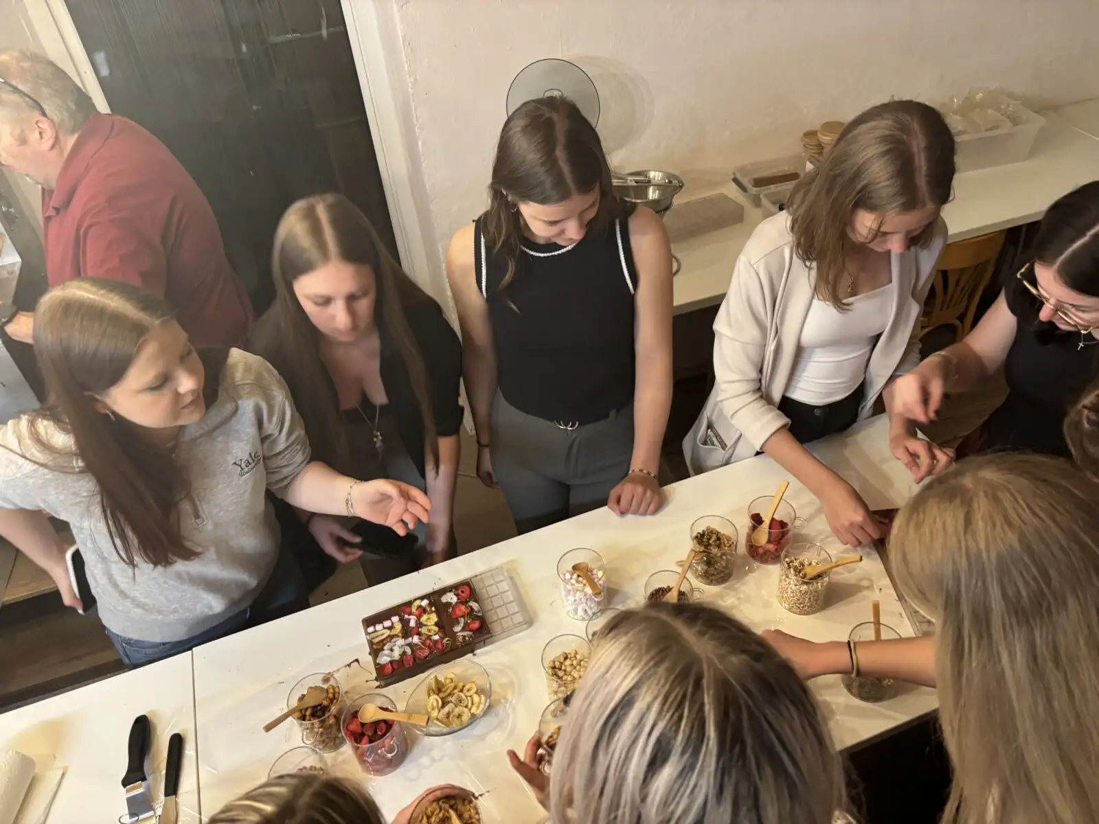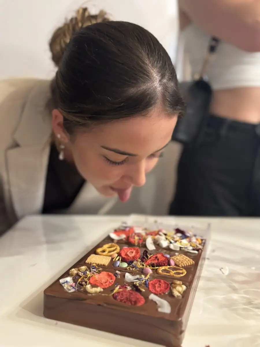 Nach einer kühlen Stärkung bei entspannter Atmosphäre im Café Dikany ging es weiter in den Schoko-Laden von Kurt und Karina Wöss. Dort erwartete die Gruppe ein Schokobrunnen mit frischen Früchten, gefolgt von Einblicken in die Kunst der Pralinenherstellung und vielen süßen Kostproben. Während Chocolatier Kurt Spannendes über seine Faszination für Schokolade erzählte, durften die SchülerInnen ihre eigene Tafel kreieren und verzieren.