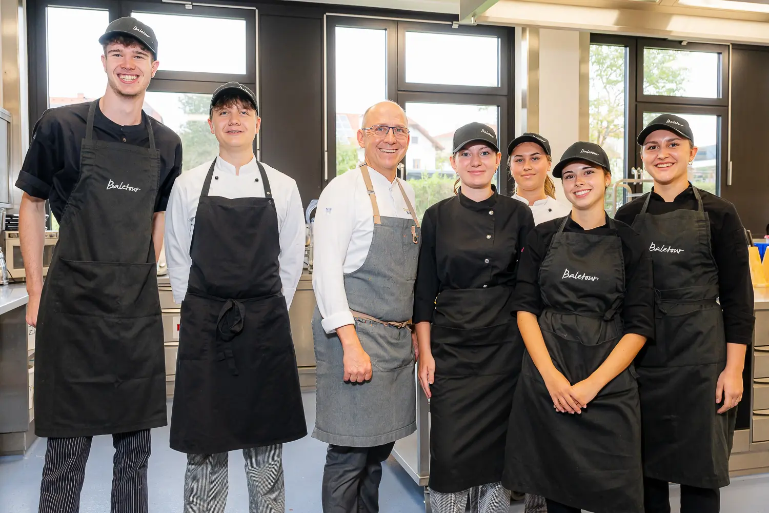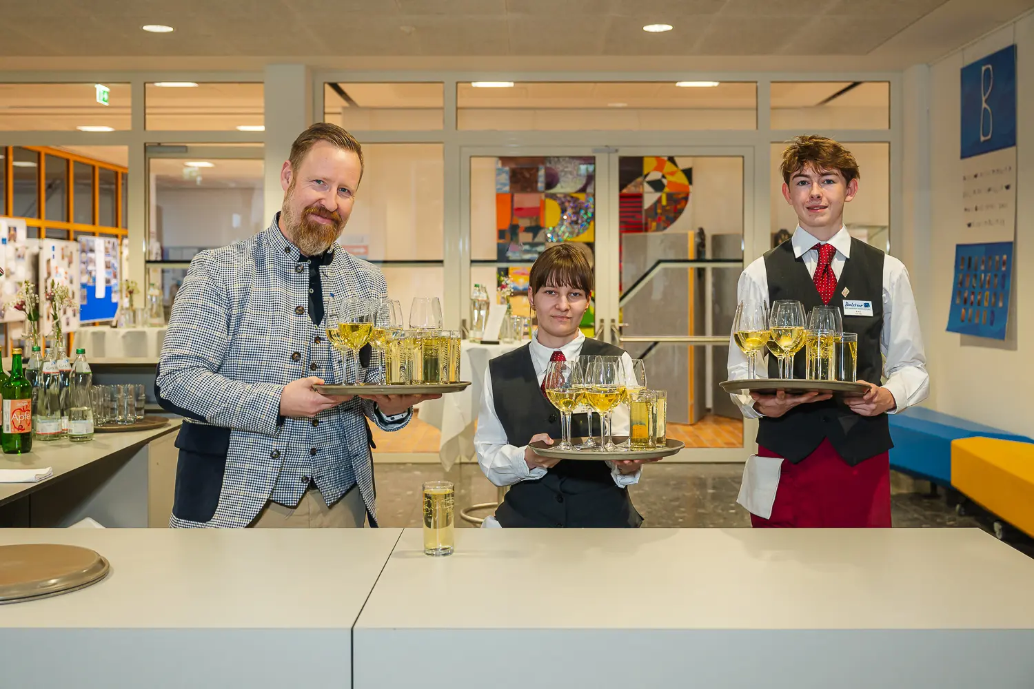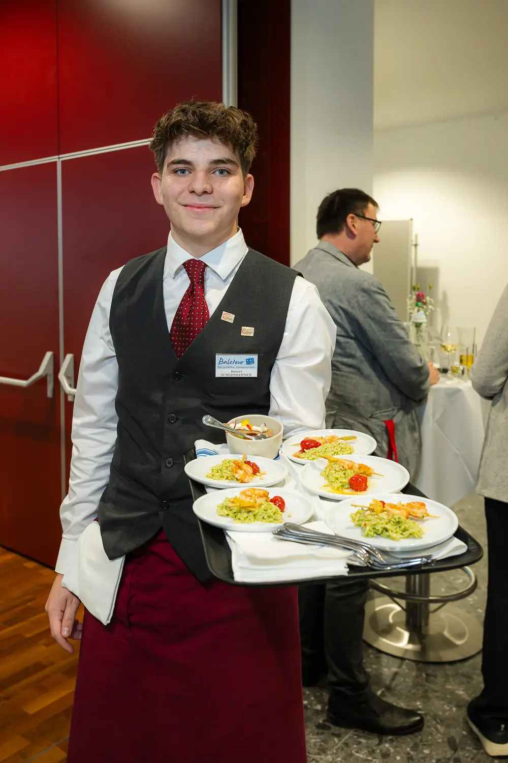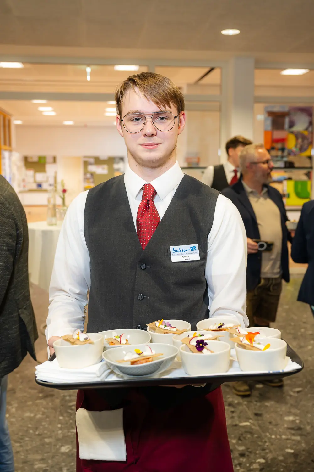 Nach dem abwechslungsreichen Programm wurden die Gäste von Baletour-Schülerinnen und -Schülern sowie den Kochlehrern mit einem Flying Dinner verwöhnt, das Köstlichkeiten wie Lachsforelle mit Brotchip, Kichererbsencurry oder Ochsenbackerl zu bieten hatte. Möge die festliche, heitere Stimmung dieses „ausgedehnten“ Nachmittags Herbert Panholzer noch lange begleiten.
