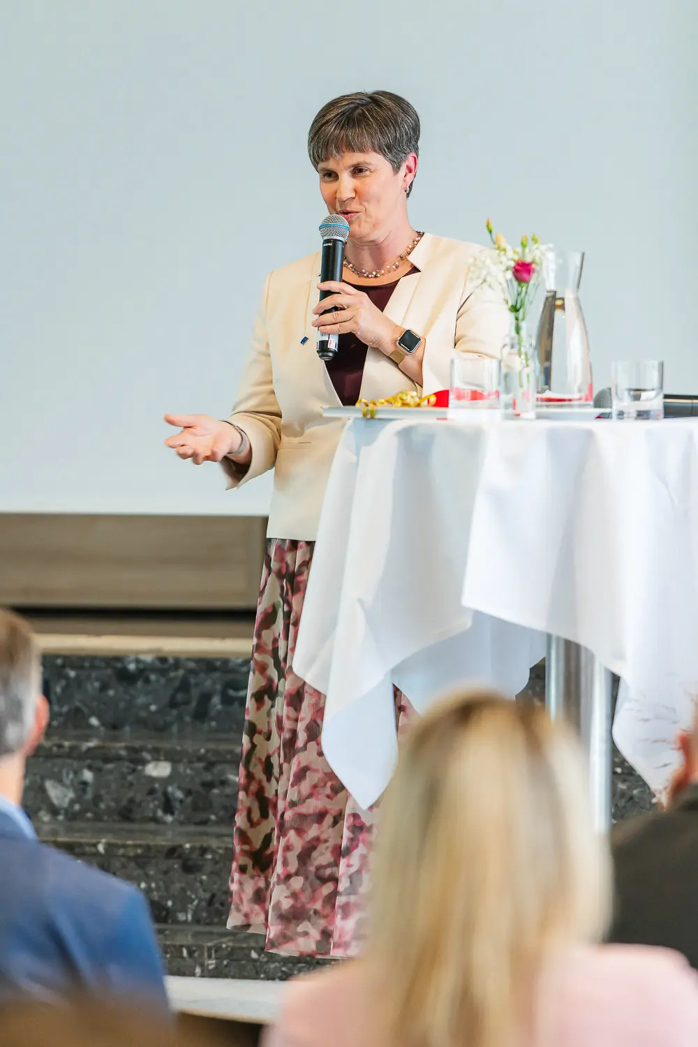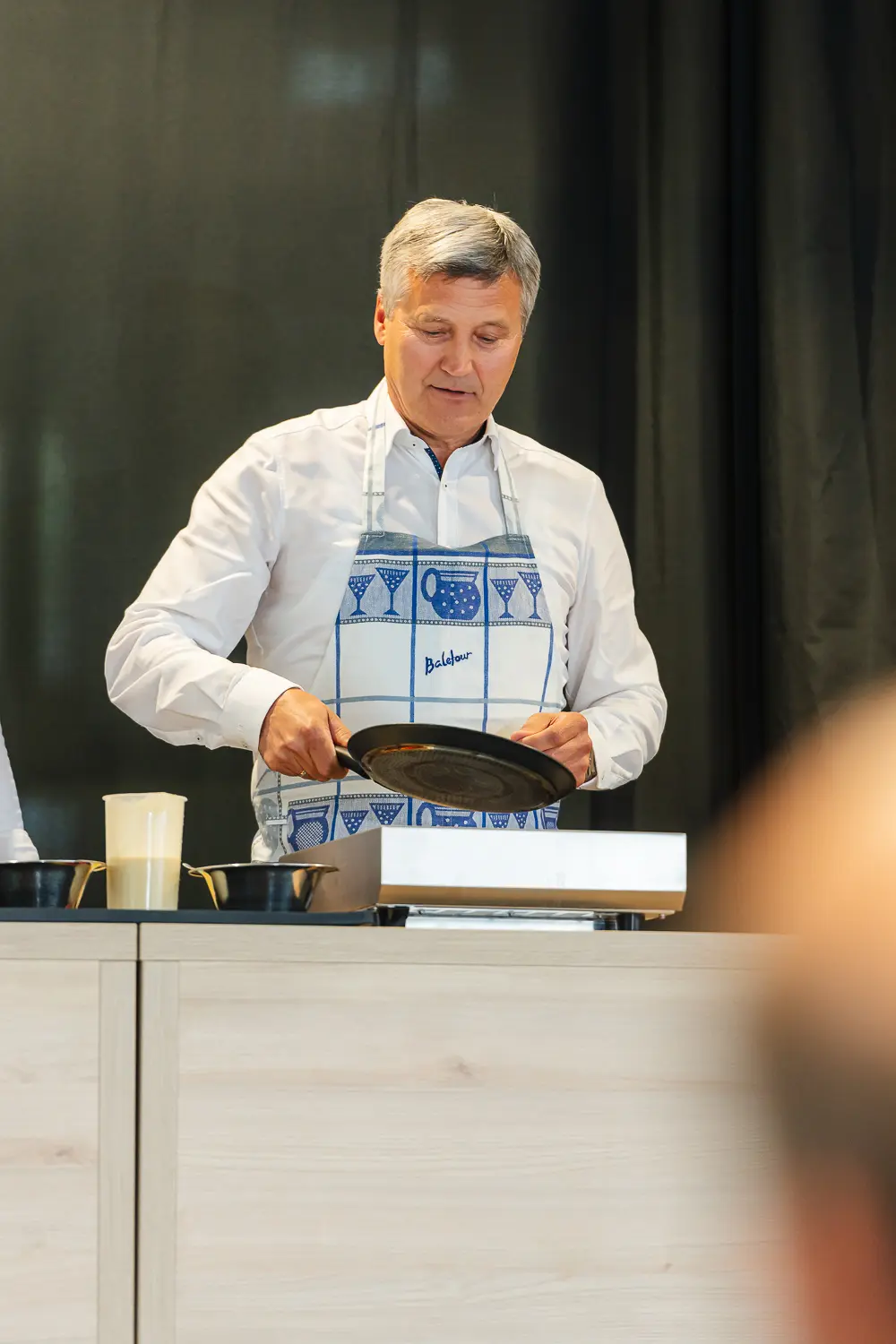 Unter den zahlreichen Gästen befanden sich neben pensionierten und aktiven Lehrerinnen und Lehrern unter anderem Bürgermeister Thomas Wolfesberger, Gerhard Huber und Dirk Andreas von der Bildungsdirektion, Wolfgang Falkensteiner von den Tourismusschulen Ischl sowie Fachgruppenobmann Gerold Royda. Nach den begrüßenden Reden von Bürgermeister und Bildungsdirektion berichtete Herbert Panholzer im Rahmen eines unterhaltsamen Interviews aus seiner Laufbahn und gab auch so manche Anekdoten preis. Anschließend stellte er seine Kochkünste unter Beweis und bereitete vor aller Augen – sowie unter kollegialer Aufsicht – eine Palatschinke und eine Piña Colada zu. Auch Silvia Schneider, allseits bekannt durch die Kochsendung „Silvia kocht“, stellte sich mit Grüßen in Form einer Videobotschaft ein. Die schwungvolle Moderation des Abends übernahm die neue Direktorin Manuela Riener gemeinsam mit Marek Rauschenbach. Für die wunderbaren Musik-Einlagen sorgten vier SchülerInnen mit ihren Instrumenten.